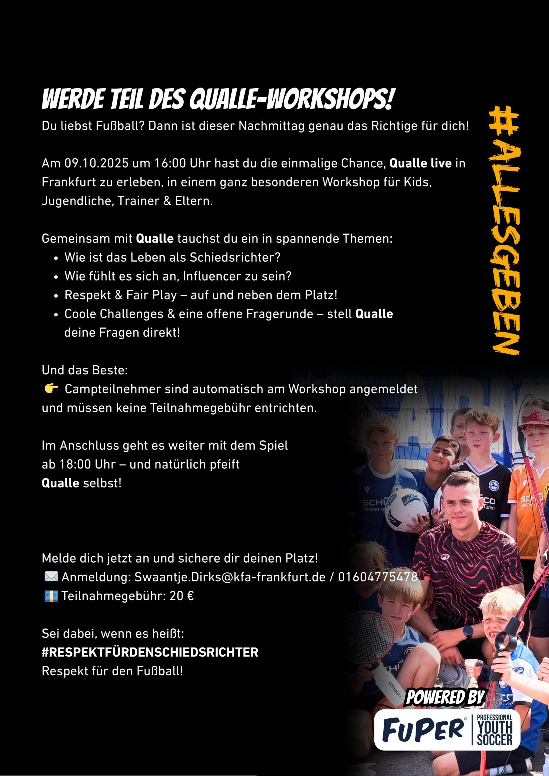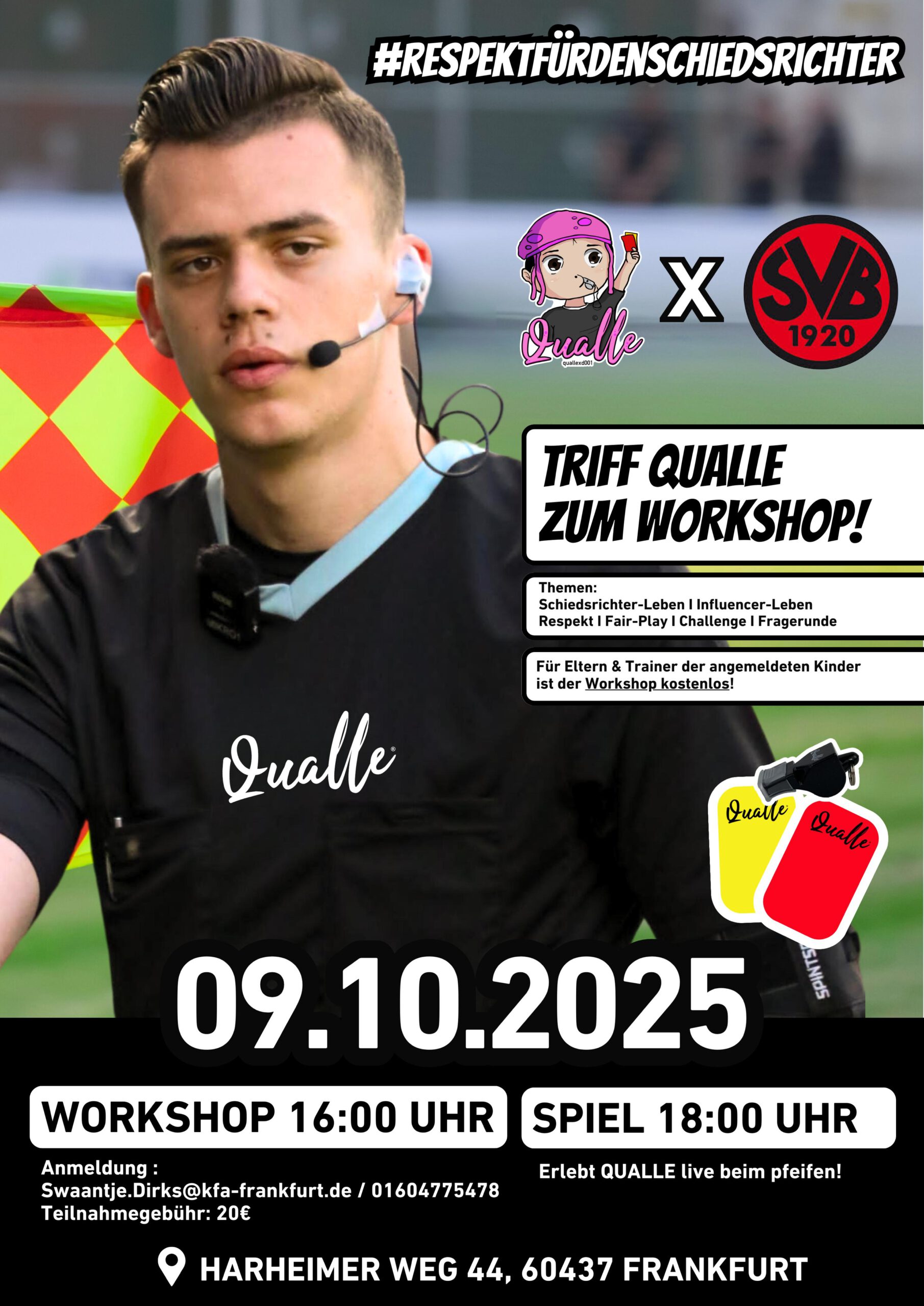 Ja wir haben es geschafft: TikTok Star Pascal Martin aka „Qualle“ (mehr als 1. Mio Follower auf Social Media) wird am Donnerstag, den 9.10.2025 um 16.00 Uhr einen Workshop (20€) über seine Arbeit als Schiedsrichter und Influencer abhalten. Kein trockener Stoff – alles in lockerer Atmosphäre wie man ihn eben kennt. Danach wird man die Schiris und ihre Arbeit mit anderen Augen sehen und besser verstehen. Lasst Euch das nicht nicht entgehen. Es gibt auch hier nur noch wenig freie Plätze. Anmeldungen bitte an unsere beiden Jugendleiter Swaantje und Stefan. Kontaktdaten hierzu im angehängten Flyer oder auch auf unserer Webseite zu finden. Bringt Eure Freunde, Verwandte, Omas/Opas, Tanten/Onkels mit, denn am Abend wird Qualle auch ein Spiel unser Jugendmannschaft (C- und D-Junioren) ab 18.00 Uhr unter Flutlicht leiten. Ein tolles Event für alle Beteilligten. Für Speis und Trank wird auf dem Platz auch gesorgt sein. Und natürlich wird Qualle auch für Autogrammkarten und Selfies zur Verfügung stehen. Also seid dabei wir freuen uns auf Euch!
