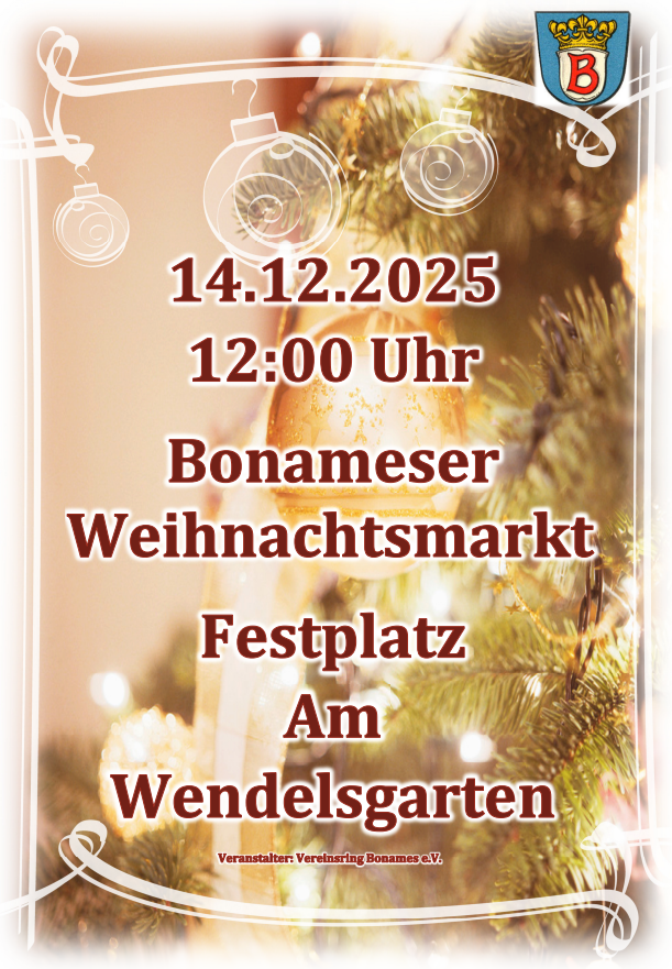Am 14.12.2025 ist es wieder soweit. Der Weihnachtsmarkt eröffnet um 12:00 Uhr seine Pforten und der SV BONAMES freut sich auf euren Besuch. Auch in diesem Jahr bieten wir leckere gegrillte Würste von der Metzgerei Haase an. Dazu gibt es eine große Auswahl an Getränken und natürlich auch ein reichhaltiges Kuchenangebot.